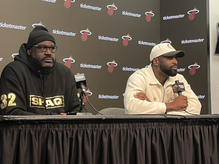 发布会期间奥尼尔吹牛说自己对现在这支热火很熟悉,韦德则调侃让他说出5个球员的名字,奥尼尔沉默了...
