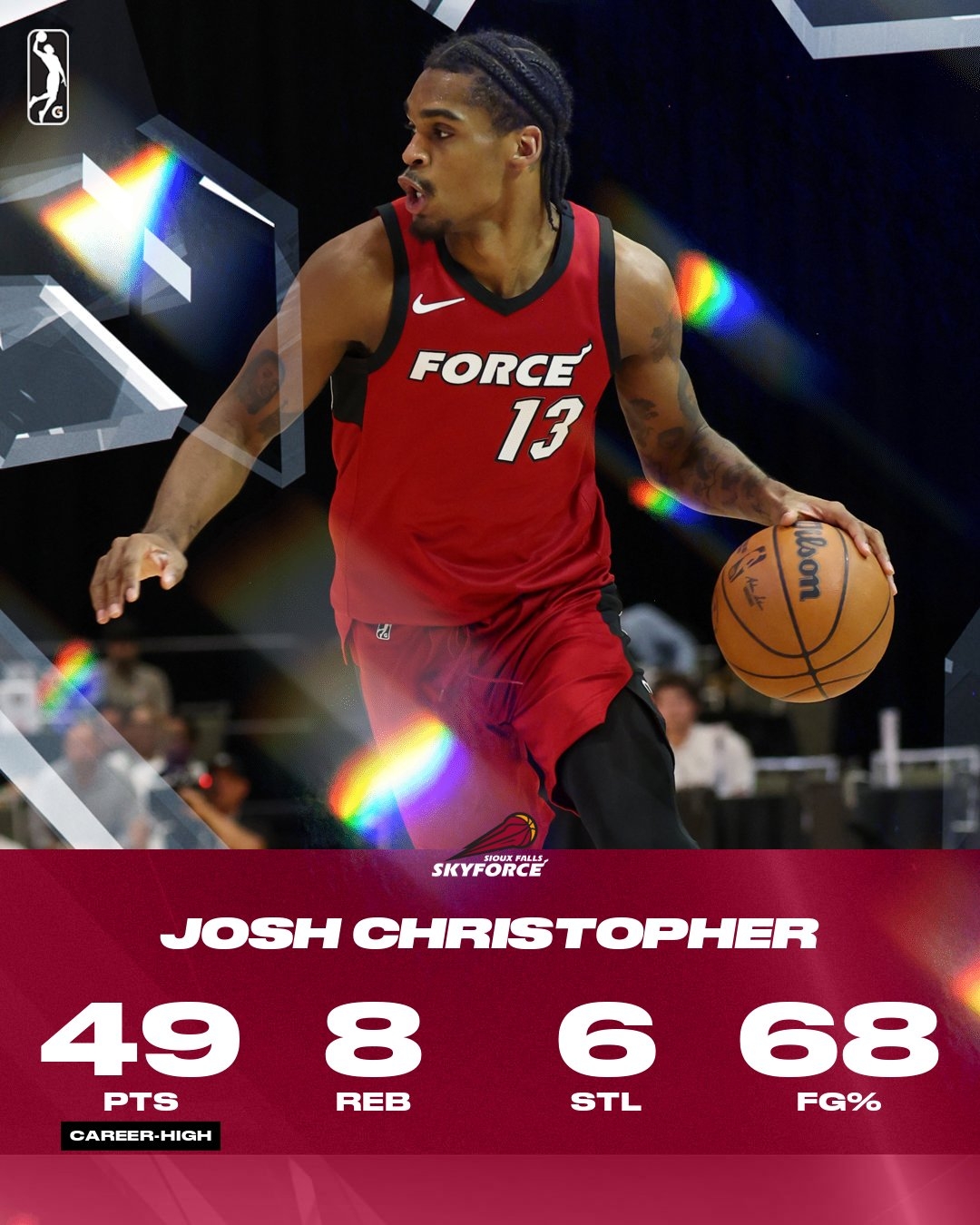 上一场对阵太阳下属球队山谷太阳,克里斯托弗23投18中,三分9中6、罚球14中12,砍下44分4篮板2助攻3抢断。